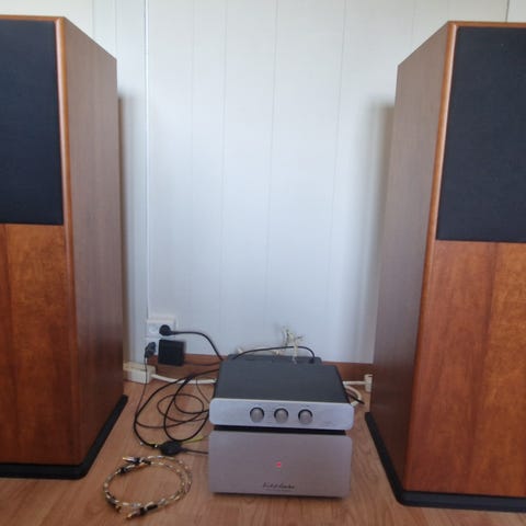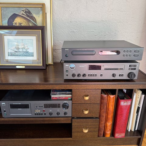 TLC høyttalere 350 W 8 Ohm, 96 db; NAD Multiple Compact Disc Player 523, NAD Stereo Integrated Amplifier C320, Argon CA 83245 DAB/FM-radio, AKAI kassettspiller. En kasse CD-plater og musikkassetter følger med.