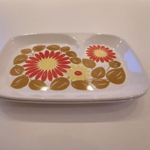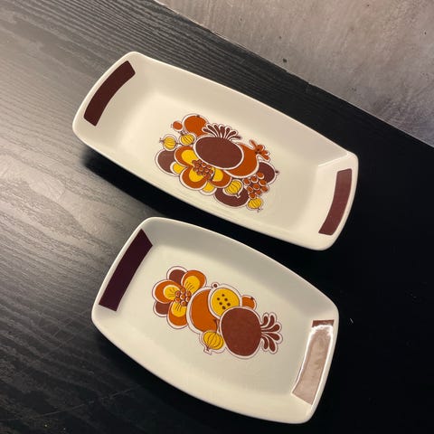 rektangulære fat med blomsterdekor i brune og gule toner. Fatene er i keramikk/porselen med trykt dekor på oversiden og stempel under. Egner seg til servering av for eksempel kaker, pålegg eller andre retter, eller som dekorfat på bord eller benk.