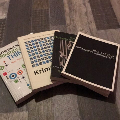Samling fagbøker innen kriminologi/sosiologi. Selges samlet for 1000 kroner. Noen bøker har litt merker fra highlighter.