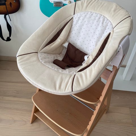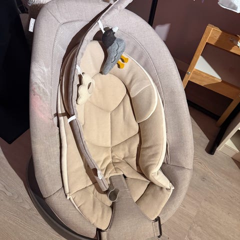 Babybjörn barnestol i beige tekstil med metallramme. Stolen har polstret sete med integrert sele og avtagbart trekk. Egnet for små barn som trenger støtte til å sitte og hvile. Passer til bruk innendørs på gulv eller bordflate med stabilt underlag, og kan enkelt flyttes mellom rom ved behov.