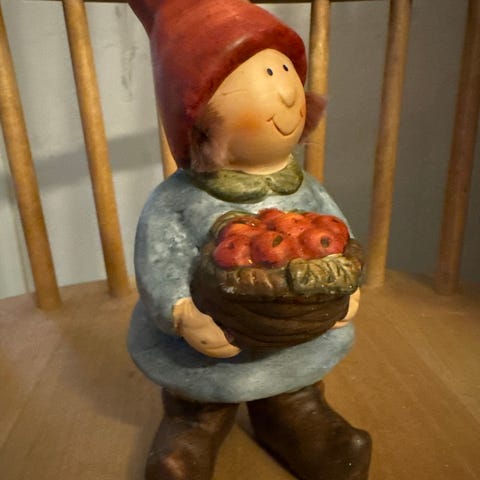 Lysestake er en julefigur som forestiller en jente i rød kjole og nisselue. Figuren holder en kurv med epler i den ene hånden og en kopp i den andre. Passer som julepynt på bord, hylle eller i vinduskarm. Figuren står på en liten sokkel og er laget som dekorasjon til jul.