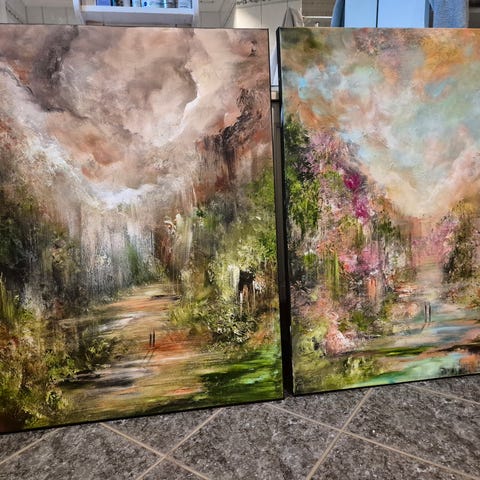 100×100cmAbstrakt maleri med landskapsmotiv i blå og brune toner. Bildet viser en lys åpning i midten med to små figurer i forgrunnen, omgitt av strukturerte flater som kan minne om klipper eller bygninger. Fargene går i nyanser av blått, grått, hvitt og brunt, med tydelige penselstrøk og tekstur i overflaten. Motiv og fargebruk gjør at maleriet egner seg godt som veggdekor i stue, gang eller andre oppholdsrom der man ønsker et rolig og stemningsfullt uttrykk.