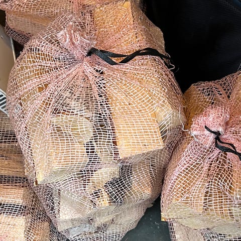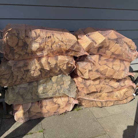 Har litt ekstra med vedsekker som kan selges.