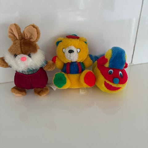 Kosedyr med regnbue farger og tidstypiske leggvarmere.