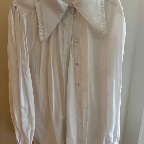 Ganni skjorte for dame i størrelse 34. Skjorten er hvit og laget av bomull. Den har lange ermer, knappelukking foran og stor krage med rysjedetaljer. Passer til hverdagsbruk og mer formelle anledninger, og kan kombineres med både bukser og skjørt. Materialet er lett og velegnet til bruk hele året. Se gjerne mine andre annonser også.