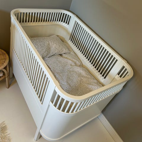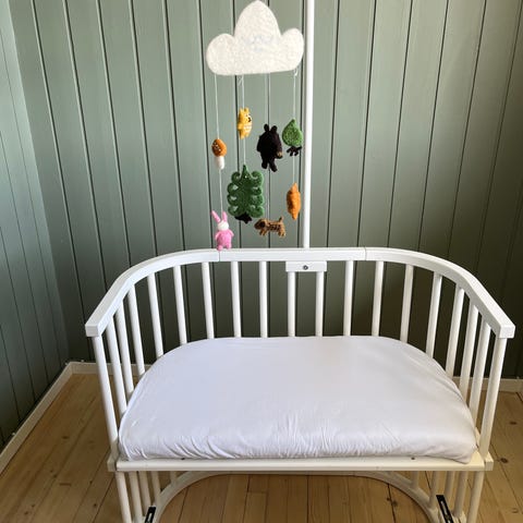 Det følger med en ekstra side som er lett å ta av og på etter ønske og behov. Madrass, laken og sengekant i hvit kan også følge med om ønskelig. Alt er fra Babybay.