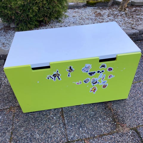 IKEA lekekasse utformet som en politibil for barn. Kassen har lokk og åpen innside som gir plass til oppbevaring av leker eller annet barneutstyr. Design med politibilmotiv på sidene og toppen. Egnet som oppbevaringsmøbel på barnerom eller lekerom