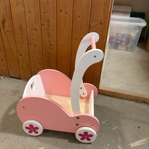 Søt sjarmerende gåvogn i tre i rosa farge med røde hjul. Vognen har håndtak til å trille og et åpent lasterom som passer til for eksempel dukker eller bamser. Egnet som støtte når barn øver på å gå, samt til lek og transport av leker innendørs. Normal bruksslitasje