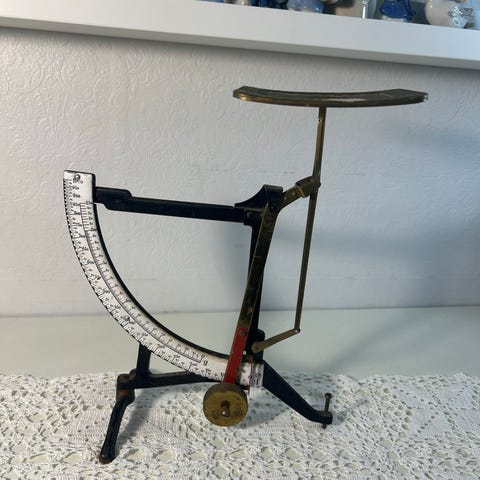 Vintage kjøkkenvekt i metall med rund skål på toppen. Vekten har analog urskive med markeringer opp til 10 kg og står på en dekorativ fot i metall. Skålen er avtakbar og laget i metall, egnet for veiing av ulike matvarer eller andre gjenstander. Passer som funksjonell kjøkkenvekt eller som dekorativt innslag i interiør.