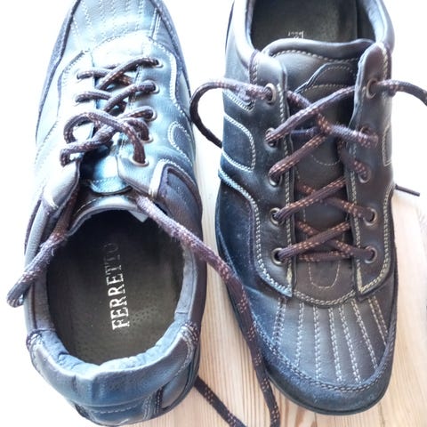 Ralph Boston sko i størrelse 41. Modellen er lave snøresko i brunt skinn med kraftig, mørk såle. Skoene har klassisk utforming med sømdetaljer langs sidene og snøring med fire hull. Passer som hverdags- eller fritidssko til høst, vinter og vår. Overdel skinn, og såle i gummi. Normal aldersrelatert slitasje etter bruk i noen år; har limt en flik av læret i overgang mellom lær og såle på innsiden av venstre sko.