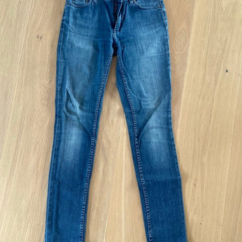 Acne Studios Skin 5 Bullet jeans for dame i blå denim. Buksen er i størrelse 32 med livvidde W26. Materialet er hovedsakelig bomull med noe elastan for stretch, ifølge vaskelappen. Klassisk 5-lommers modell med glidelås og knapp i front, beltehemper og smal passform. Egnet til hverdagsbruk og kan kombineres med ulike topper og sko for både uformelle og mer oppkledde antrekk.