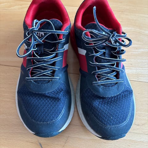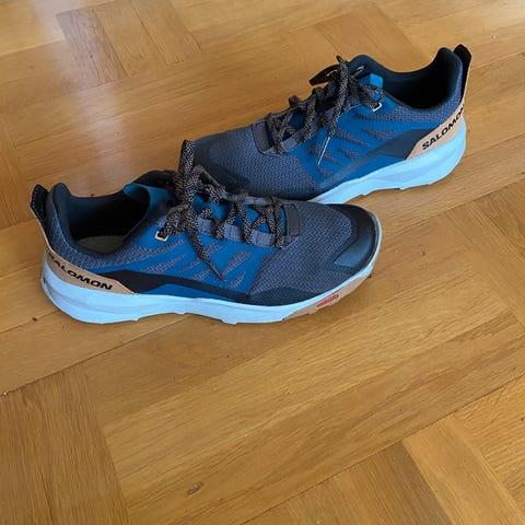 Helly Hansen joggesko i størrelse 39 1/3 Skoene er i blå nyanser med lyse detaljer og snøring. Overdelen ser ut til å være i pustende tekstil med syntetiske forsterkninger, og sålen er i gummi med mønster for godt grep. Egner seg til hverdagsbruk og lett aktivitet.