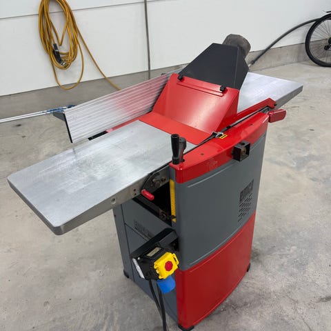 Maskinen står på hjul for enkel forflytning i verkstedet. Egnet for tykkelses justering /avretting av treemner til ønsket tykkelse. Har tilkobling for sponavsug og betjeningspanel plassert på siden av maskinen. Anlegget til avretter. Passer for trearbeid i verksted, hobbyrom eller mindre produksjonsmiljøer der det er behov for nøyaktig tykkelseshøvling av materialer.