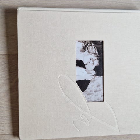 Spiralinnbundet fotoalbum i kvadratisk format, ca. 24 x 24 cm. Omslag i rosa stoff med lite vindu på forsiden for bilde. Albumet har 20 svarte ark (dvs. 40 sider) på innsiden, egnet for innliming av bilder, utklipp eller annen scrapbooking. Passer til oppbevaring av fotografier, minner og andre papirartikler.
