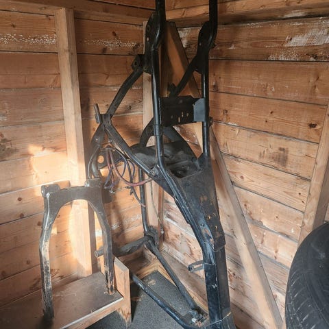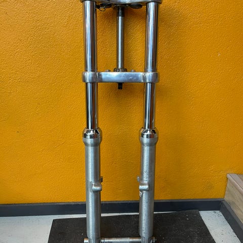 Gaffel som har stått på en 49mod Harley Davidson Panhead Hydra Glide. Følger med bremsekaliper av ukjent model, Tolle bremsepumpe, helt ny fremskjerm.