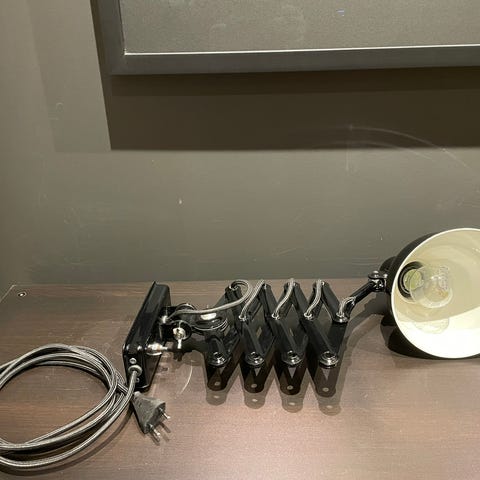 Den er i god, original, vintage stand med normal, aldersrelatert bruksslitasje som gir den en flott patina. Skjermen er svingbar og kan dreies mot nærmest alle retninger, mens armen kan justeres frem og tilbake. Armen er chromet og utstyrt med et håndtak av malt treverk på midten.