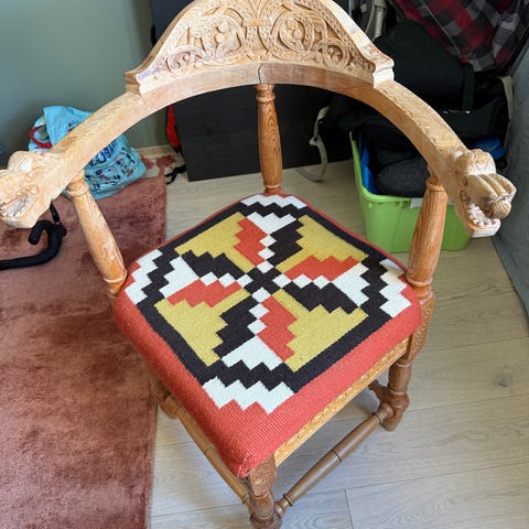 Vakker antikk stol. Ulstoff, fint mønster og farge.