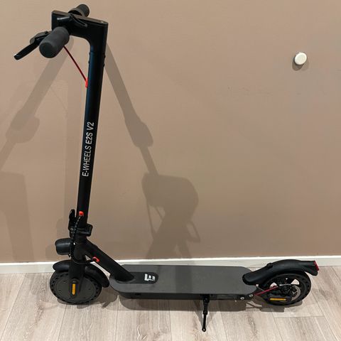 E-Wheels E2S V2 LR elsparkesykkel i svart farge. Modellen har ståbrett med sklisikkert belegg, sammenleggbart styre og støtte. Den er utstyrt med frontlys og baklys for bedre synlighet. På styret sitter et display som viser batterinivå og gir tilgang til grunnleggende funksjoner. Egner seg til persontransport på kortere og mellomlange distanser på asfalt og jevnt underlag.