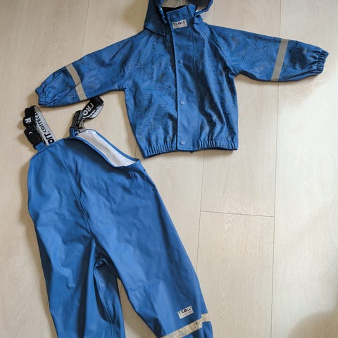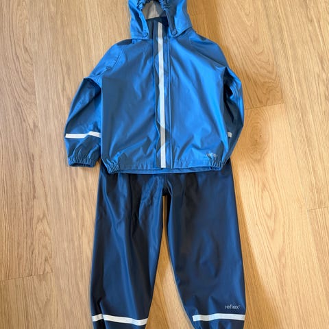 Blått regntøy fra Reflex med selebukse og jakke. Solid materiale. Ingen hull eller slitasje. Str. 110.
