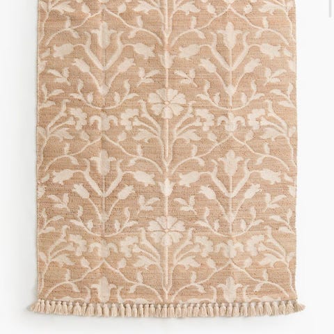 Teppe i størrelse 170x240 cm med flatvevd struktur. Bunnfarge i natur/offwhite med mønster i dempede farger som beige, brun, grønn og rosa. Rektangulær form med dekorativt, gjentakende mønster over hele flaten.