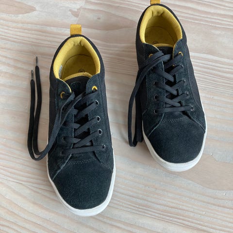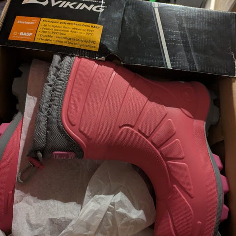 Viking overgangssko i modell Equip Mid WP 1V i størrelse 38. Ble dessverre for små før ma rakk å ta de skikkelig i bruk. Skoene er ankelhøye med snøring og borrelås øverst for god tilpasning og lette å ta av/på. Overdelen er i mørk, gråsvart farge, med lys/hvit mellomsåle og lilla yttersåle med grovt mønster for godt grep. Passer til hverdagsbruk og uteaktiviteter for barn og ungdom. Kun brukt et par ganger. Ny pris 1049.