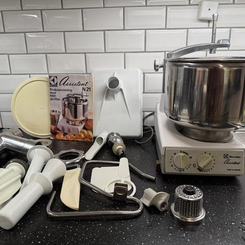 Kjøkkenmaskinen leveres med bolle, visp og eltekrok. I tillegg følger det med flere tilbehør, blant annet blender med glasskolbe og knivblad, samt kjøttkvern med skrue og diverse deler. Det ligger også annet standardtilbehør på bildene, som ulike røre- og elteredskaper.