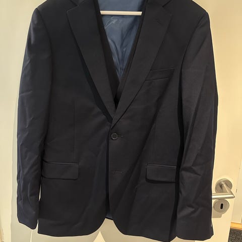 Hugo Boss Angelico dress størrelse 54. Dressen er blå og laget av 100 % virgin ull, med fôr i viskose. Klassisk modell med to knapper foran, brystlomme og klaffelommer. Innvendige lommer med røde detaljer.