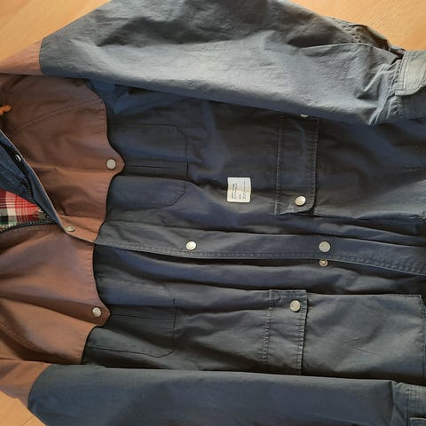 Jakke / anorakk fra merke Sondre. I bomull med skinndetaljer, rødt fleecestoff inni. Den er synlig brukt, men i god stand.