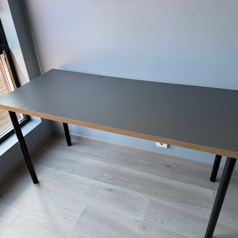 Bordplaten har noen små bulker/merker etter bruk av monitorarm. Disse er på kanten av bordplaten og er lite synlige ved vanlig belysning, men kan ses om lyset treffer på skrå.