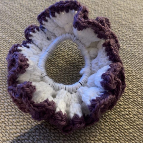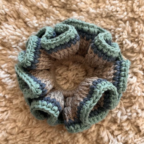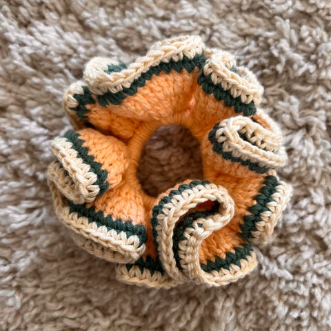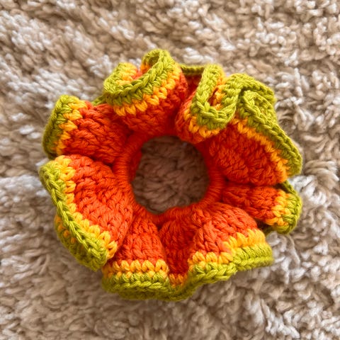 Min datter (12år) hekler hårstrikk i fine vår/påskefarger 💛💚🩷🤍 og selger de for 40,- /stk