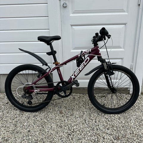 Xeed XC JR barnesykkel med 20" hjul (6-8 år). Sykkelen har dempegaffel foran, felgbremser og støtte. Rammen er i rosa farge med svarte detaljer, og sykkelen er utstyrt med skjermer bak og komfortsete.