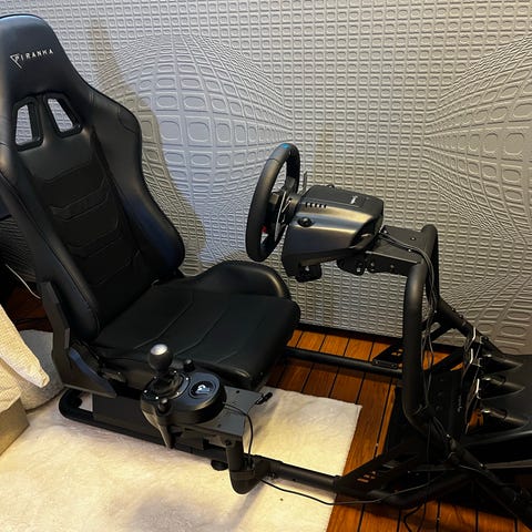Settet består av et Logitech G29 ratt med flere knapper og dreiehjul på rattet, samt trepedalssett med gass, brems og clutch.