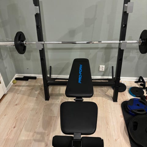 Justerbar benkpress, stang, 67.5 kg vekt og oppbevaring
