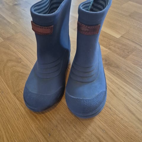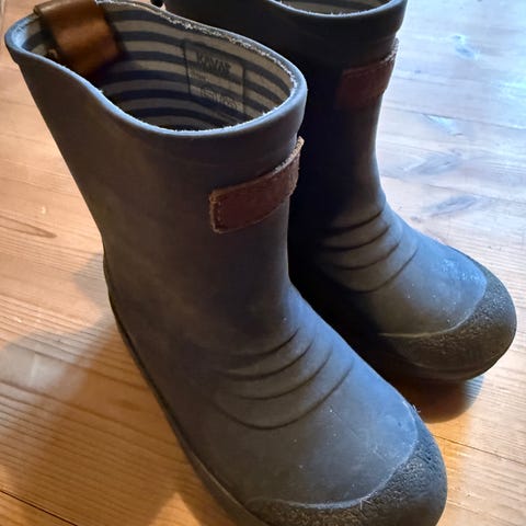 Kavat gummistøvler til barn, unisex, i størrelse 30. Støvlene er i mørk farge med stripet tekstilfôr på innsiden og kraftig yttersåle med grovt mønster. Egnet til bruk i vått vær og på underlag der det er behov for vanntett fottøy.
