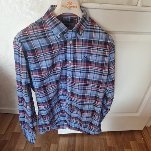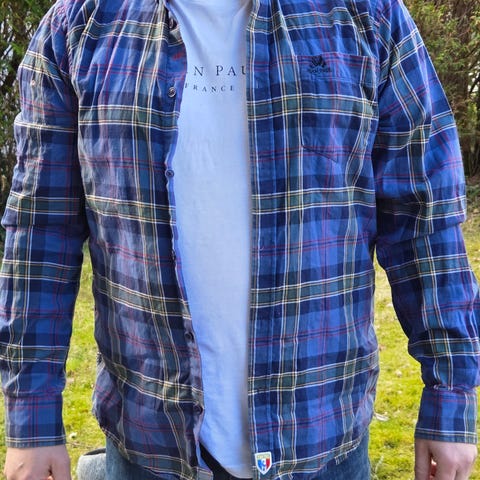 Jean Paul skjorte for herre i størrelse M. Skjorten er flerfarget med rutemønster, hovedsakelig i rødt, hvitt og mørkeblått. Merkelappen angir at den er strykefri (wrinkle free). Skjorten har lange ermer, knappelukking foran og klassisk krage. Egner seg til både hverdagsbruk og mer formelle anledninger der en rutete skjorte passer.