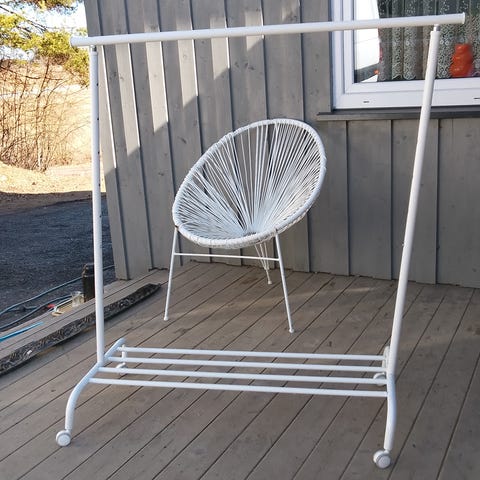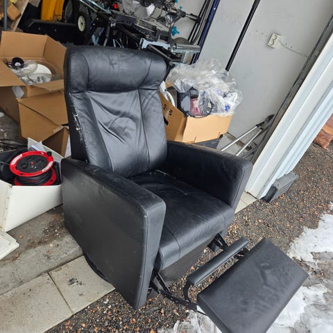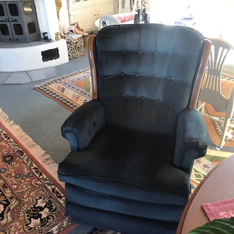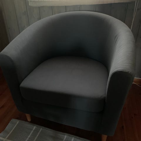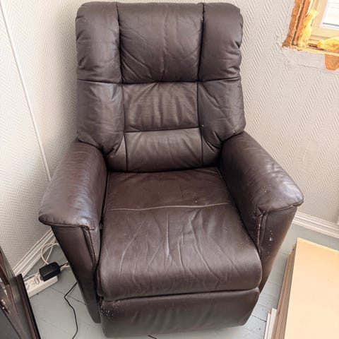 Stolen er godt brukt og har en liten rift på høyre armlene.