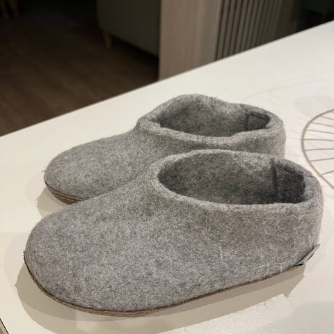 Pent brukt, det eneste er noe flekkete såle på høyre tøffel, ingen synlige feil ellers.