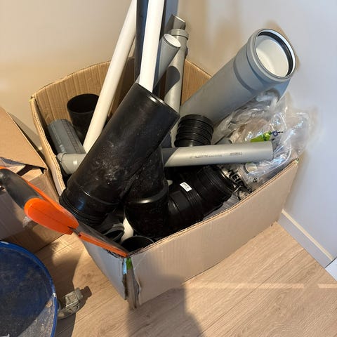 Spirorør ventilasjonsrør i metall gis bort. Rørene er rette og buede seksjoner som kan brukes til ventilasjonsanlegg eller annen luftføring. Overflaten er støvete og har bruksspor. Et er innbøyd på midten. Egnet for prosjekter der det er behov for ventilasjonskanaler i metall, for eksempel i garasje, bod eller verksted. Dimensjoner og eksakt lengde måles ved interesse.