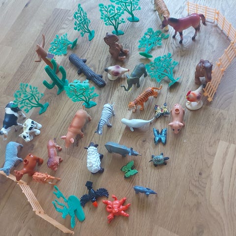 Dinosaur lekesett med flere små dinosaurfigurer, palmer og gjerder. Settet inkluderer en lekematte med dinosaurmotiv som kan brukes som underlag for lek, samt et stort grønt plastegg og et mindre rødt egg til oppbevaring av figurene. Egnet som rollelek og temalek med dinosaurer for barn.