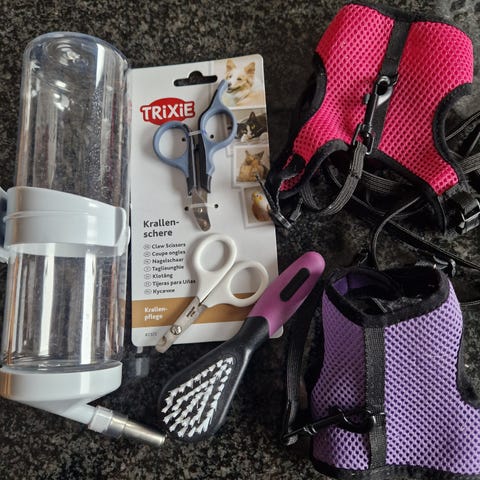 Utstyr brukt til kaninene selges samlet. En drikke flaske, liten seler til å gå tur. Kjempe fin tunnel med pels og stav til trening. Ikke brukt.