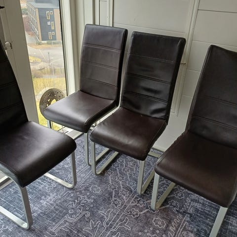 Selger 4stk spisestoler i mørkeblått stoff.