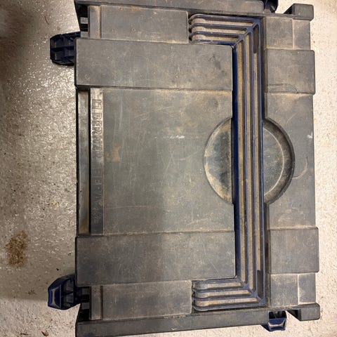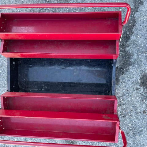 Ubrukt verktøykasse fra Biltema i metall. Klassisk utfellbar modell med bærehåndtak og flere rom for oppbevaring av håndverktøy og smådeler. Egnet til organisering og transport av verktøy i verksted, garasje eller på byggeplass.