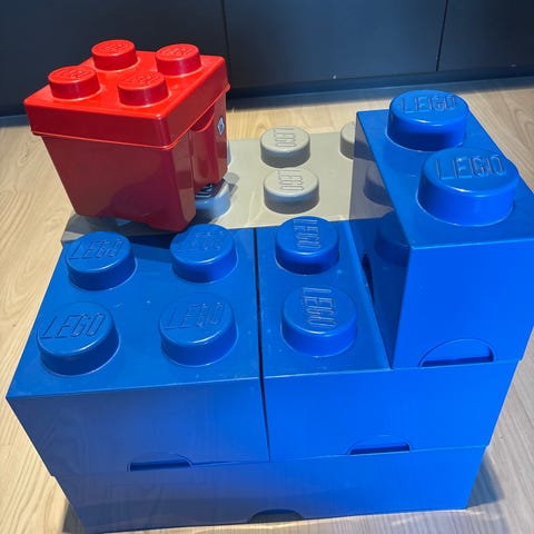To pent brukte bokser fra Lego, den blå er fra 1985 og den turkise fra 2010.
