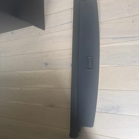 Volvo bagasjeromstrekk for montering i bagasjerom. Trekket fungerer som en rullegardin, dekker lasterommet og festes i sidene bak, som vist på bildene. Egnet for å skjule innhold i bagasjerommet og beskytte mot sollys og innsyn. Har vært brukt i en Volvo V90, 2017 mod.