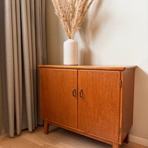 Selger en skjenk i teak/palisander grunnet flytting. En nett og stilig retro skjenk, med god lagringsplass. Skjenken er nok av voksen alder så den har litt diverse bruksmerker, bl.a små avskallinger i fineren (se bilder for mer detaljer). Håper vi finner den et nytt hjem der den kan leve videre!