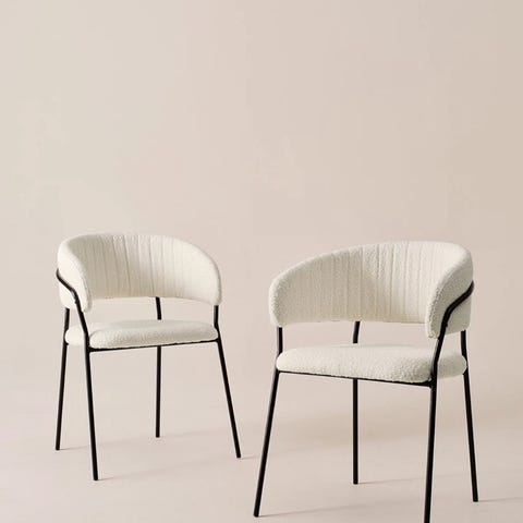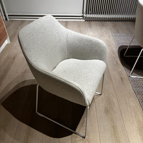 Selger IKEA TOSSBERG stol i beige tekstil – Heltrukket sete og rygg med integrerte armlener, metallunderstell i hvitt. Passer som spise- eller kontorstol hjemme.