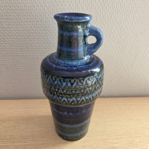 Veldig fin, vintage, keramikkvase med hank i brun, grønn, hvit og blå glasur. Fra Arol, Halden. Keramikk vase har et dekorativt mønster rundt midten og en blank glasert overflate. Blomstervase er fra 1960, 1970 tallet. Kan minne om Bitossi. Ingen skader og lite bruksmerker. Merket under.