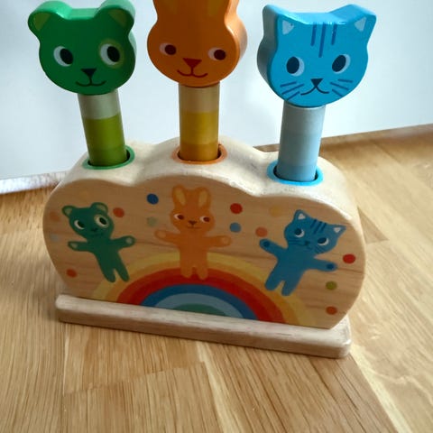 Solid og fin treleke. Trykk på dyrene så spretter de opp. Passer til 1-2 år.