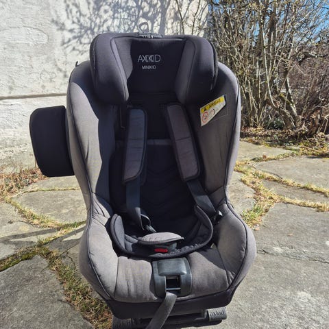 Axkid Minikid barnesete for barn opptil 25 kg. Setet monteres bakovervendt og festes med bilens trepunktsbelte og forankringsstropper. Brukt av oss et or ferier ved behov for å ha bakovervendt barnesete i forsete. Kjøpt brukt men god stand, ingen ulykker.