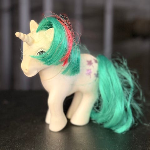 Original My Little Pony Baby Blossom fra Hasbro, 1984. Pent brukt, men er ikke forsøkt vasket. Øyne, «hår» og trykk i god stand.